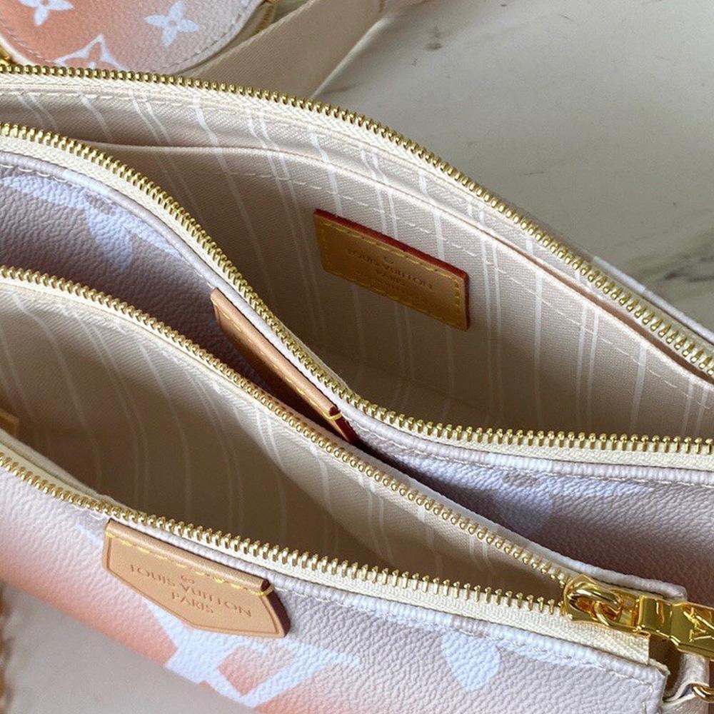 The Multi Pochette Accessoires is a hybrid cross-body bag with multiple pockets and compartments that brings together a Pochette Accessoires, a Mini Pochette Accessoires and a Round Coin Purse. Fashioned from Monogram canvas with a mini Monogram pattern on the sides of the two pochettes, it has both a removable gold-tone chain and an adjustable Louis Vuitton inscribed Jacquard strap for multiple carrying options.